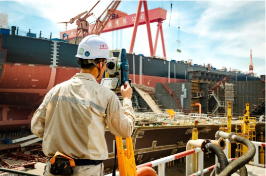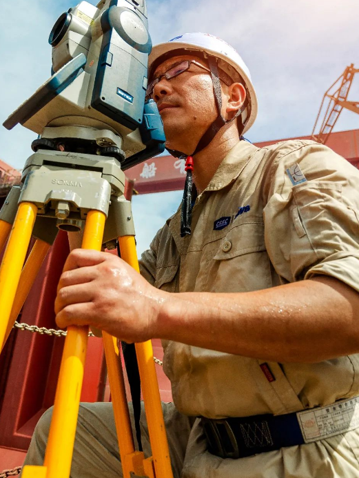 近40度的高溫天氣下,一位造船精度人堅(jiān)守崗位,使用全站儀監(jiān)控船塢每個搭載總段的定位精度,保障一次搭載到位。