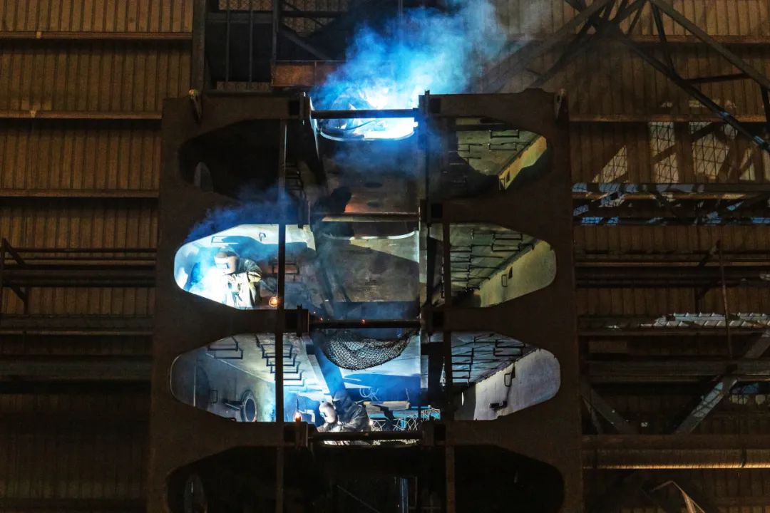 △動(dòng)力部件焊工正在焊接WinGD 8X92機(jī)架