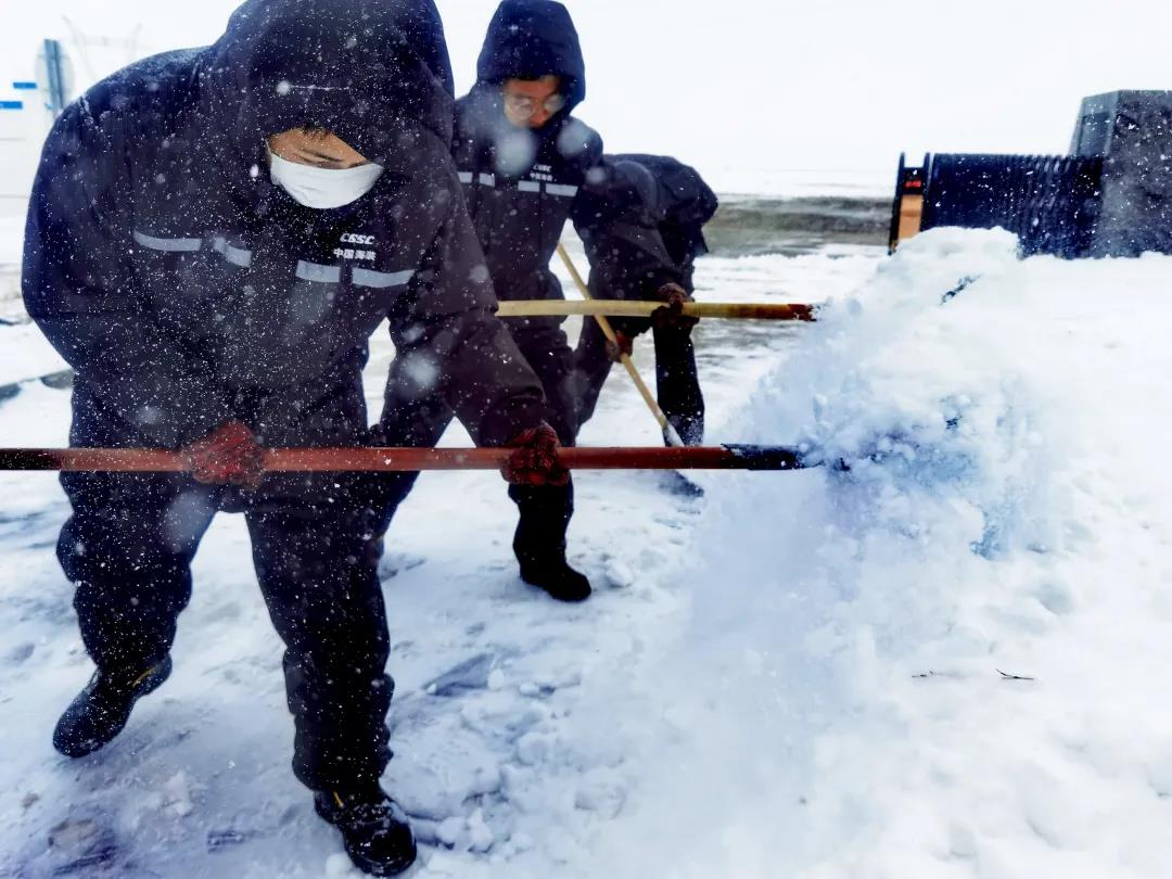 進(jìn)入11月,內(nèi)蒙古自治區(qū)錫林郭勒盟地區(qū)迎來大面積的暴風(fēng)雪,烏達(dá)萊項(xiàng)目人員在趕往風(fēng)場(chǎng)的路上遭遇積雪路段,雖然氣候嚴(yán)寒,但為了及時(shí)消除機(jī)組故障,大家在積雪路段采取挖雪推車的方式齊心協(xié)力,一同開展清理路面積雪的行動(dòng)。這個(gè)冬日,冰雪阻擋不住海裝追風(fēng)者們勇往直前的步伐,他們只為恪盡職守完成一個(gè)承諾——風(fēng)機(jī)旋轉(zhuǎn)、帶來光熱。