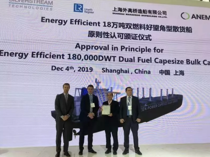 ????12月4日,中國(guó)船舶集團(tuán)所屬上海外高橋造船有限公司隆重推出兩款集多種節(jié)能環(huán)保技術(shù)于一身的“Energy Efficient”18萬噸級(jí)雙燃料好望角型散貨船和30萬噸級(jí)雙燃料超大型原油船新船型。展會(huì)上,英國(guó)勞氏船級(jí)社為18萬噸級(jí)雙燃料好望角型散貨船頒發(fā)了AiP證書;英國(guó)勞氏船級(jí)社和美國(guó)船級(jí)社為30萬噸級(jí)雙燃料超大型原油船頒發(fā)了AiP證書。