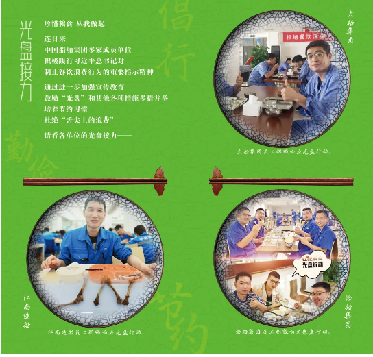 為認真貫徹落實習近平總書記關于制止餐飲浪費行為的重要指示精神,大力弘揚中華民族勤儉節約、珍惜糧食的文明用餐習慣,中國船舶集團積極開展“制止餐飲浪費 踐行光盤行動”專項宣傳引導活動。