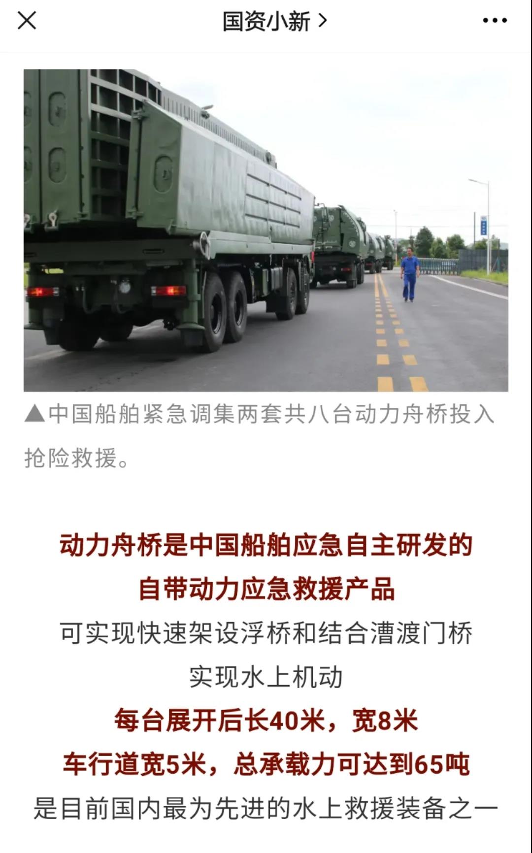 在本次搶險(xiǎn)救援任務(wù)中,中船應(yīng)急制造的應(yīng)急動力舟橋被稱作“救援航母”,先后被多家媒體報(bào)道多次霸屏。