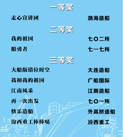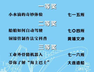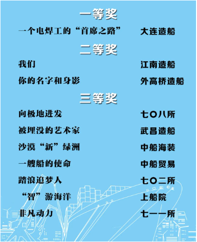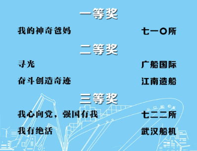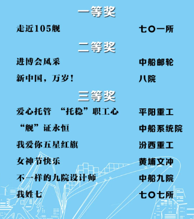 由中國船舶集團黨群工作部指導,中國船舶集團新聞宣傳中心/中國船舶報社承辦的中國船舶集團第二屆短視頻大賽圓滿落幕。經過前期篩選,網絡投票,并特邀國務院國資委新聞中心、國防科工局新聞宣傳中心、中央電視臺、微博政務、中國船舶集團黨群工作部專家評審,大賽最終評出一等獎5部,二等獎10部,三等獎23部,同時評出優秀組織獎單位6家。名單如下,快來圍觀!