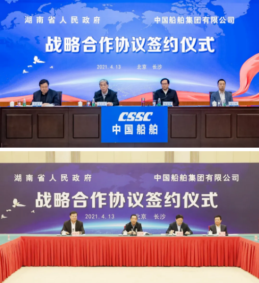 4月13日,中國船舶集團有限公司與湖南省人民政府通過“云簽約”方式簽署戰略合作協議。中國船舶集團黨組書記、董事長雷凡培,黨組副書記、總經理楊金成,黨組成員、副總經理盛紀綱,湖南省委書記、省人大常委會主任許達哲,省委常委、省委秘書長張劍飛,省委常委、省國資委黨委書記姚來英出席簽約儀式。中國船舶集團黨組成員、副總經理錢建平,湖南省人民政府副省長陳飛分別代表雙方在協議上簽字。簽約前,雙方圍繞共同服務國家戰略、深入推進雙方戰略合作進行了交流。