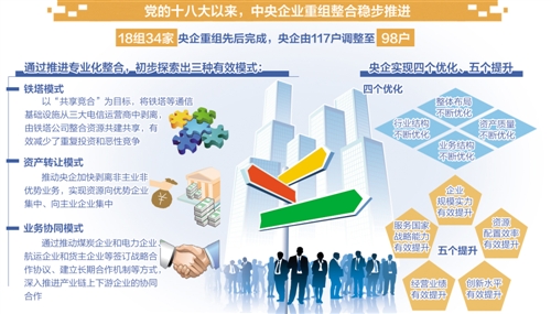 黨的十八大以來,中央企業的重組整合,成為國企改革的重要內容。5年來,中央企業的重組整合穩步推進,國務院國資委先后完成18組34家央企重組,央企由117戶調整至98戶。