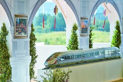 在開工儀式上展出的中國“復興號”高鐵列車模型。新華社發(fā)