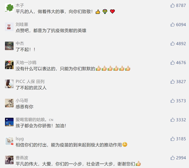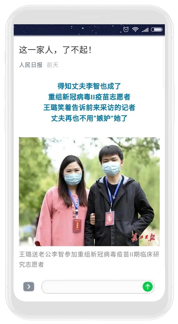 ????4月18日,人民日報微信公眾號推送了這樣一條消息,詳細介紹了一位土生土長的武漢人王璐及其家人自愿報名接種新冠疫苗的事跡,消息收獲了10萬+的閱讀量與3.2萬的“在看” ,還有動輒幾千的留言點贊!這位女主角王璐來自中國船舶集團七一七所,不同于第一批結(jié)束醫(yī)學觀察的志愿者,王璐所在組的年齡在20歲到50歲,是最早一批高劑量的接種者。