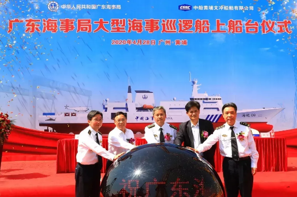 △ 4月28日,七〇一所設(shè)計(jì)的廣東海事局大型海事巡邏船上船臺(tái)。