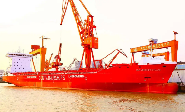 5月12日,黃埔文沖為法國達(dá)飛輪船集團(tuán)建造的1400TEU雙燃料集裝箱“CONTAINERSHIPS STELLAR”號交付。
