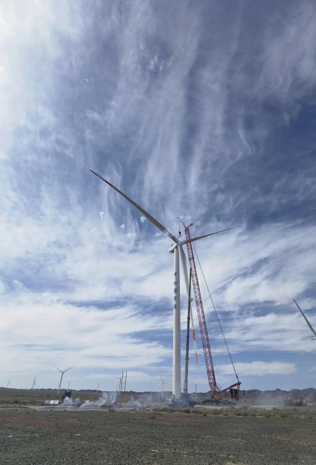該項(xiàng)目于4月12日啟動首臺機(jī)組吊裝,中國海裝項(xiàng)目人員提前制訂吊裝調(diào)試方案及安全預(yù)案,采取“邊吊裝邊調(diào)試”的方式加快整體工程進(jìn)度,克服戈壁灘高溫天氣和疫情反復(fù)等困難,于7月10日實(shí)現(xiàn)首批100MW實(shí)現(xiàn)全容量并網(wǎng),8月20日實(shí)現(xiàn)59臺機(jī)組全部吊裝。