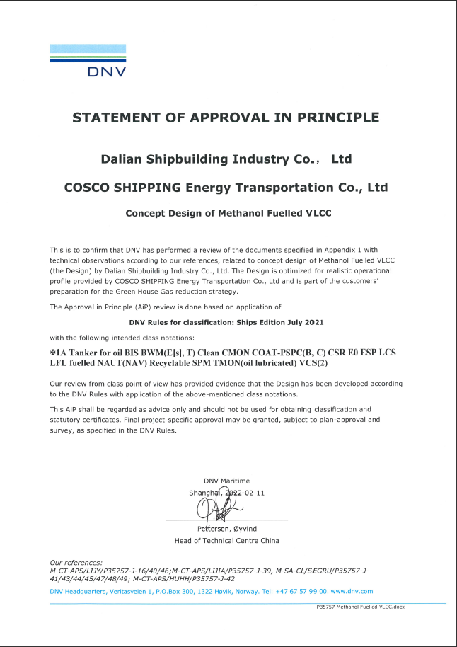 甲醇燃料VLCC分別獲得DNV、CCS船級社AIP認可。