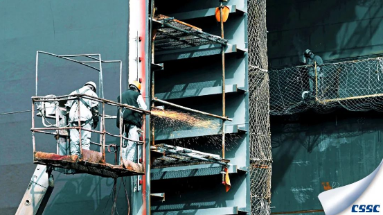 在30萬噸VLCC施工現場,大船人正在進行艏艉兩大段合攏口部位的精度修正作業。該作業方式是大船集團經過多年建造經驗,通過三維數據管理、吊裝精度控制、環形段高精度切割等多種多部門協調后達到一次對接,標志大船集團已完全掌握高難度高精度的合攏方式,在國際上富有極高的競爭力。
