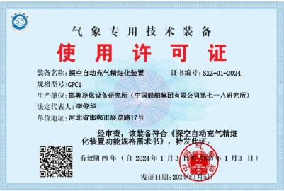 日前,中國船舶集團七一八所研制生產(chǎn)的GPC1型探空自動充氣精細(xì)化裝置,成功獲得中國氣象局頒發(fā)的氣象專用技術(shù)裝備使用許可證,成為繼GQD1型自動水電解制氫設(shè)備后,第二個獲此證書的裝置,在氣象領(lǐng)域開拓中邁出重要一步。