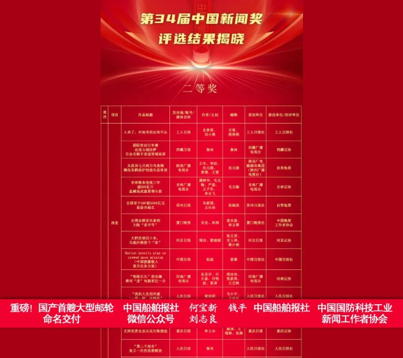 11月7日,中華全國新聞工作者協會主辦的第34屆中國新聞獎評選結果揭曉。中國國防科技工業新聞工作者協會推薦中國船舶報社特約記者何寶新、記者劉志良主創、錢平編輯的作品《重磅!國產首艘大型郵輪命名交付》獲消息類二等獎。
