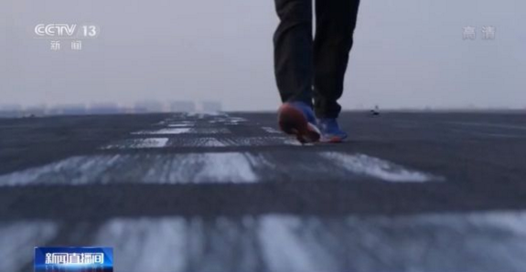 總臺央視記者李寧:這個就是在陸地上來模擬航母艦載機著陸的平臺。我們在這個地方呆了兩天,直到今天日落黃昏,才終于有機會走上這個平臺。因為它艦載機訓(xùn)練的頻次非常頻繁,我們只有在訓(xùn)練的間歇,才有機會帶大家來看一下。這里都是黑黢黢的一片,所以這個地方就叫做黑區(qū)。這一道道胎印就見證著這支艦載機部隊從無到有,一步步成長的過程。
