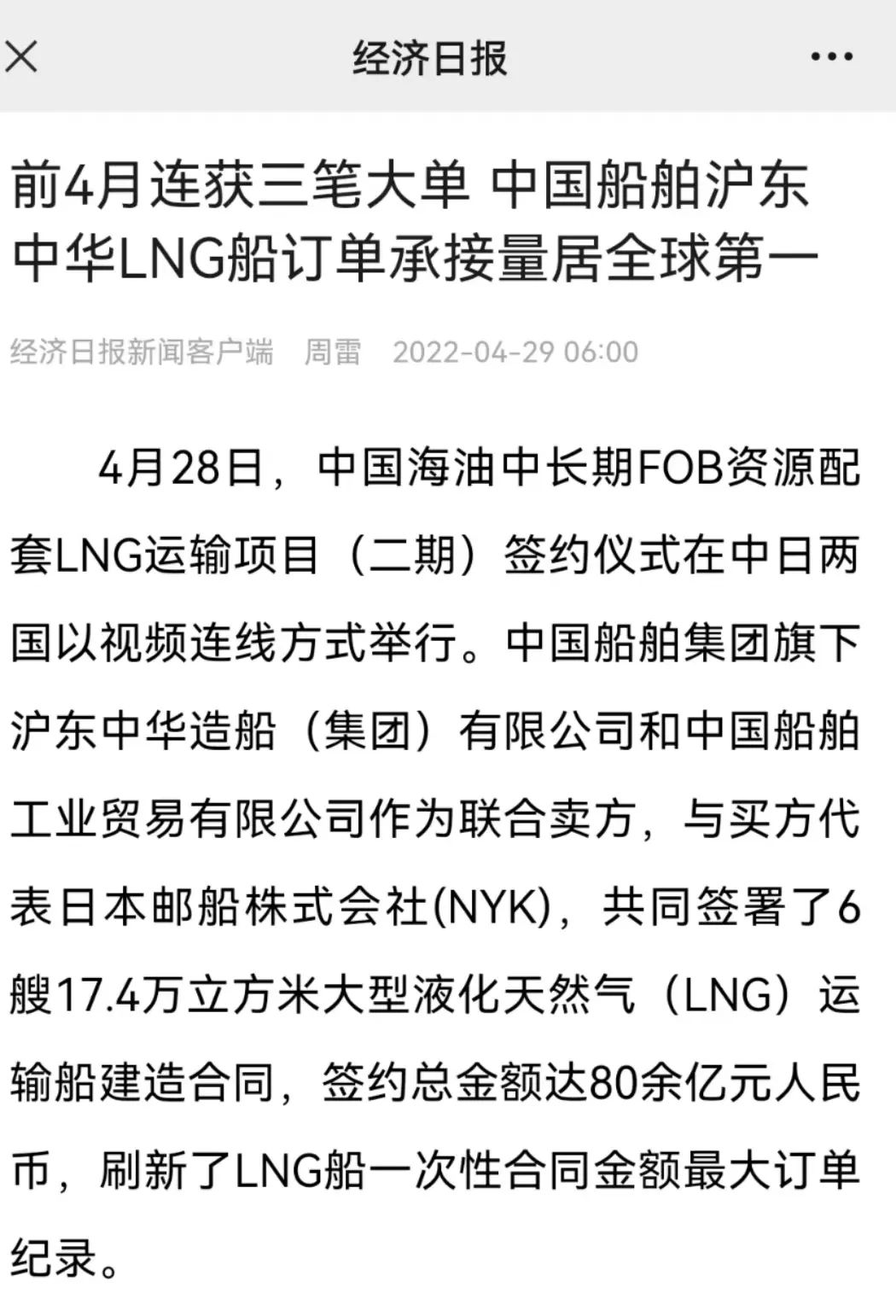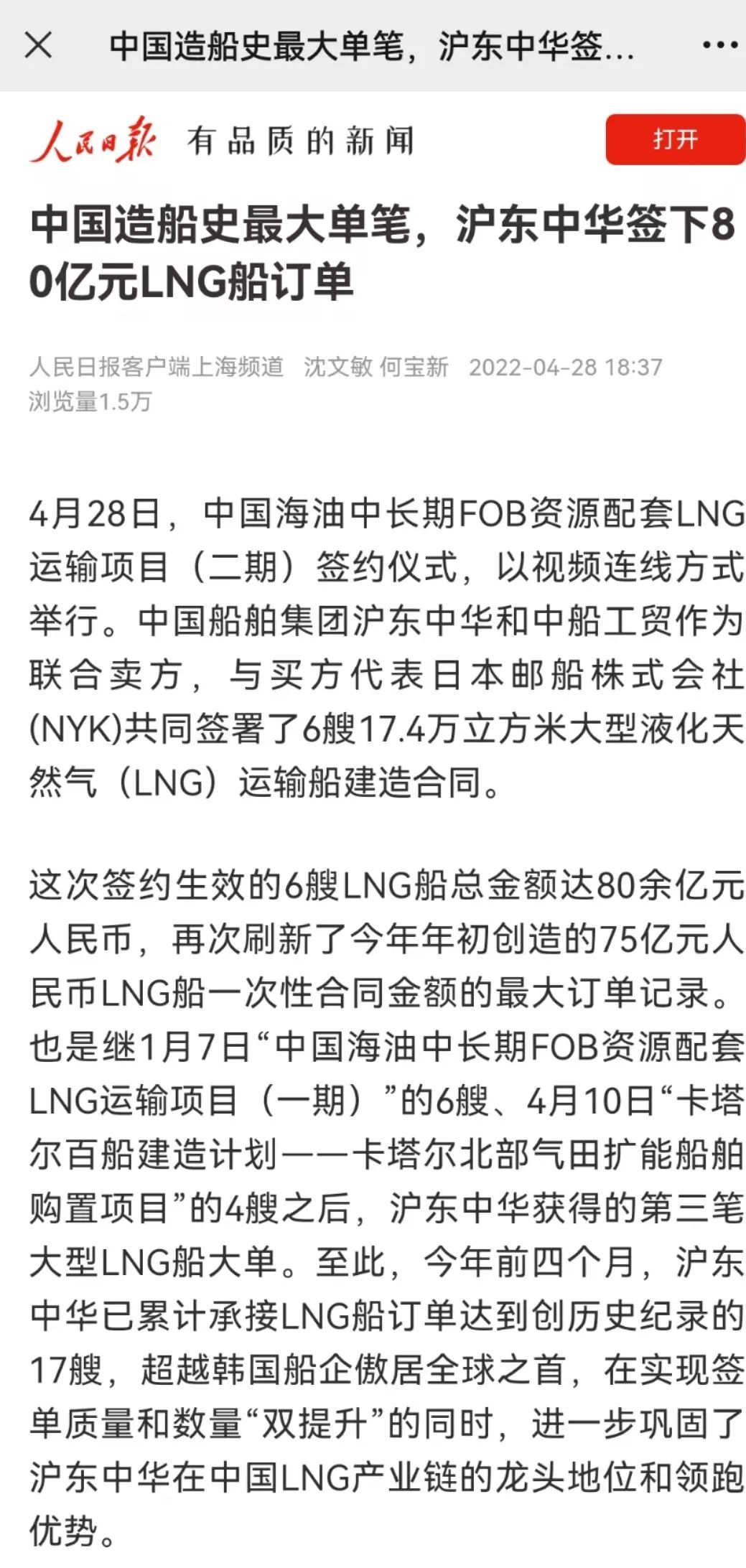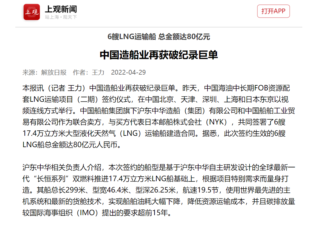 這次簽約生效的6艘LNG船總金額達80余億元人民幣,再次刷新了今年年初創造的LNG船一次性合同金額最大訂單紀錄。至此,今年前4個月滬東中華已累計承接LNG船訂單達到創歷史紀錄的17艘,超越韓國船企傲居全球之首,在實現簽單質量和數量“雙提升”的同時,進一步鞏固了滬東中華在中國LNG產業鏈的龍頭地位和領跑優勢。