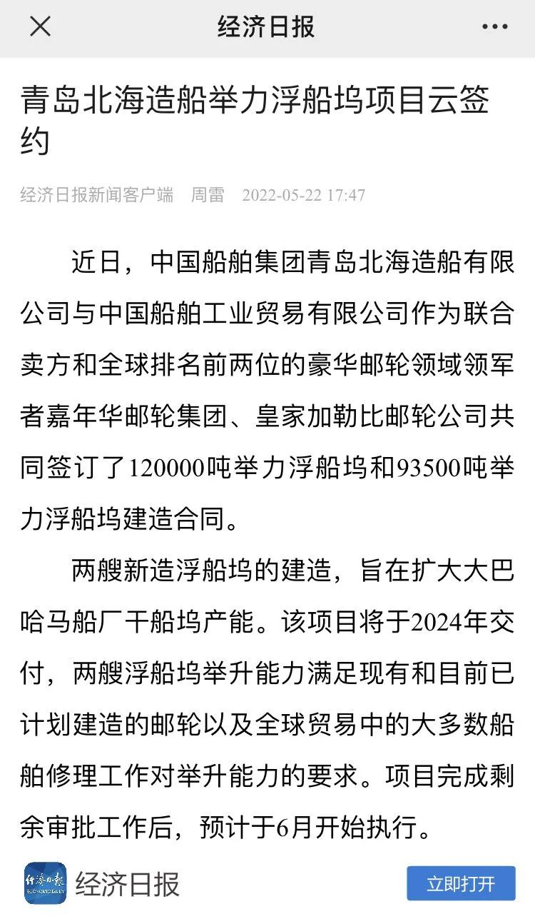 日前,中國(guó)船舶集團(tuán)旗下北海造船與中船貿(mào)易作為聯(lián)合賣方,與嘉年華郵輪集團(tuán)、皇家加勒比郵輪公司共同簽訂了1艘12萬(wàn)噸舉力浮船塢和1艘9.35萬(wàn)噸舉力浮船塢建造合同。中國(guó)船舶集團(tuán)黨組書記、董事長(zhǎng)雷凡培,黨組成員、副總經(jīng)理孫偉,嘉年華集團(tuán)總裁兼首席執(zhí)行官阿諾德·唐納德,皇家加勒比集團(tuán)總裁兼首席執(zhí)行官杰森·利伯特共同見證此次“云”簽約。
