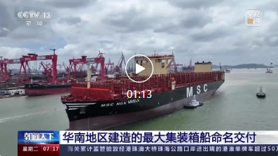 7月24日,由中國船舶集團旗下廣船國際聯合中船貿易建造的16000TEU集裝箱船1號船命名交付,中央電視臺《朝聞天下》進行了報道。