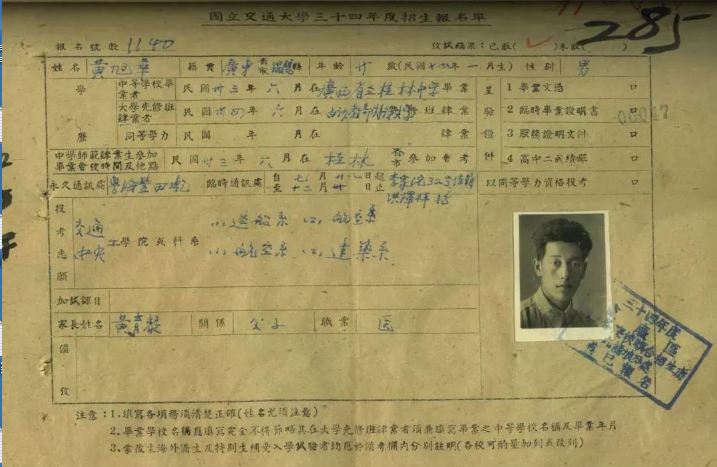 “國立交通大學(xué)”這所當(dāng)時(shí)在科學(xué)技術(shù)領(lǐng)域全國首屈一指的學(xué)術(shù)殿堂,在黃旭華心中是神圣而遙遠(yuǎn)的。以至于當(dāng)真正有機(jī)會(huì)填寫被保送大學(xué)的名字時(shí),他竟然沒有勇氣填上“國立交通大學(xué)”的名字,只填上了一個(gè)中央大學(xué)的航空系。