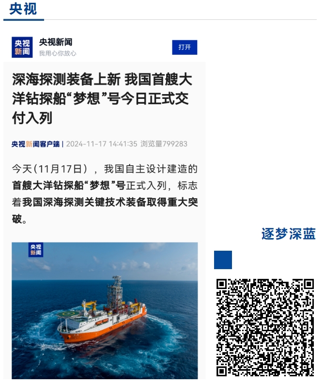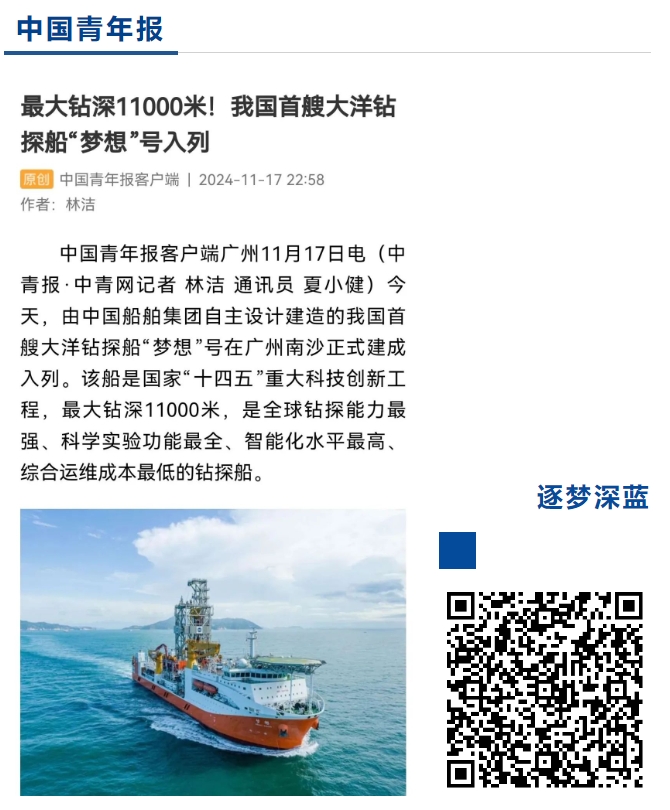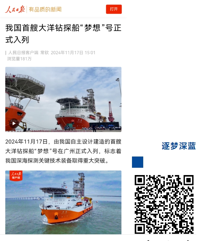 11月17日,中國(guó)船舶集團(tuán)自主設(shè)計(jì)建造的我國(guó)首艘大洋鉆探船“夢(mèng)想”號(hào)在廣州南沙交付入列,人民日?qǐng)?bào)、新華社、央視等媒體的記者來(lái)到交付現(xiàn)場(chǎng)進(jìn)行報(bào)道 。