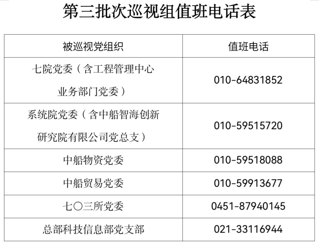 巡視期間,集團(tuán)公司黨組巡視組設(shè)置值班電話和聯(lián)系信箱,主要受理反映被巡視黨組織領(lǐng)導(dǎo)班子及其成員、下一級(jí)黨組織領(lǐng)導(dǎo)班子主要負(fù)責(zé)人和重點(diǎn)崗位領(lǐng)導(dǎo)干部問題的來信、來電、來訪,重點(diǎn)關(guān)注違反政治紀(jì)律、組織紀(jì)律、廉潔紀(jì)律、群眾紀(jì)律、工作紀(jì)律、生活紀(jì)律以及巡視整改等方面問題反映。第三批次巡視受理信訪截止時(shí)間為9月22日。