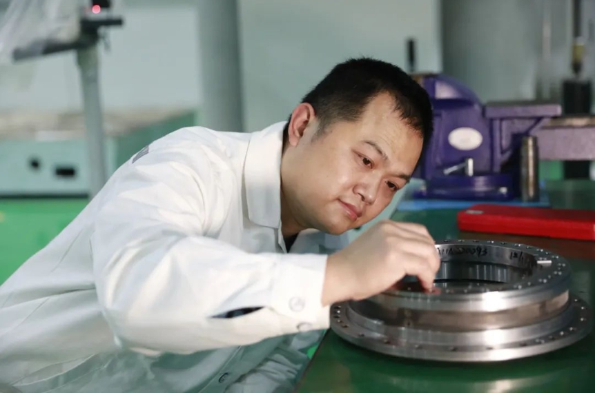 “必須持之以恒地以精益求精、精雕細琢的工匠精神打造所經(jīng)手的每個產(chǎn)品!”這是周虎常提的一句話。燃氣輪機機匣零組件制造精度要求高,裝配質(zhì)量控制嚴,其加工、裝配工藝技術代表機械制造行業(yè)的先進水平。武漢船機首套燃氣輪機機匣產(chǎn)品裝配工作由周虎帶領班組成員進行,其高超的技能水平保障了產(chǎn)品的裝配質(zhì)量與進度。在25兆瓦燃氣輪機過渡段機匣葉片裝配過程中,因葉片與機匣外環(huán)裝配為燕尾槽式的榫接結構,葉片榫頭與燕尾榫槽三面的接觸面積要求高達80%以上,需由鉗工拂配以達該指標。葉片榫頭拂配過程中,周虎采用銼刀銼削裝配面,利用其長期磨練掌握的良好手感,將銼削量誤差控制在0.005-0.01毫米,大大減少了葉片試裝配次數(shù),裝配效率顯著提升。